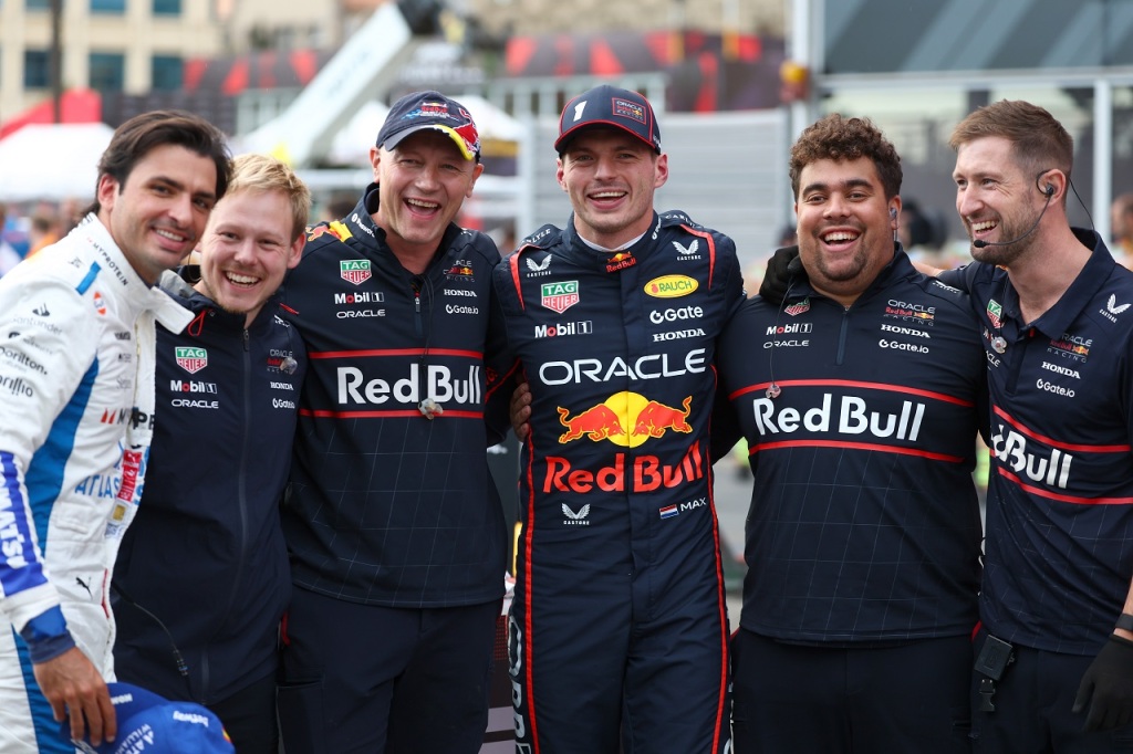2025年F1第17戦アゼルバイジャンGP予選後会見 左から2番手カルロス・サインツ(ウイリアムズ)、PPマックス・フェルスタッペン(レッドブル)、3番手リアム・ローソン(レーシングブルズ)