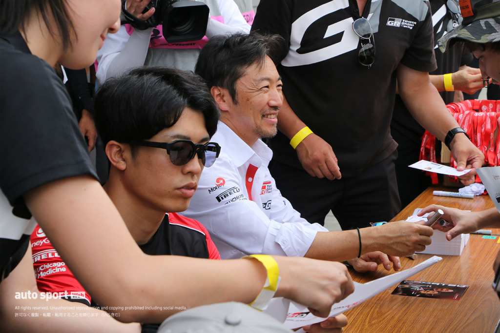 富士スピードウェイで行われたTPCに参加した坪井翔(写真左)と、ハースF1の小松礼雄代表