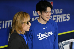 2025年3月に東京ドームで開催されたMLB開幕戦で日米両国歌を演奏したYOSHIKIさん/写真はYOSHIKIさんと佐々木朗希(ドジャース)