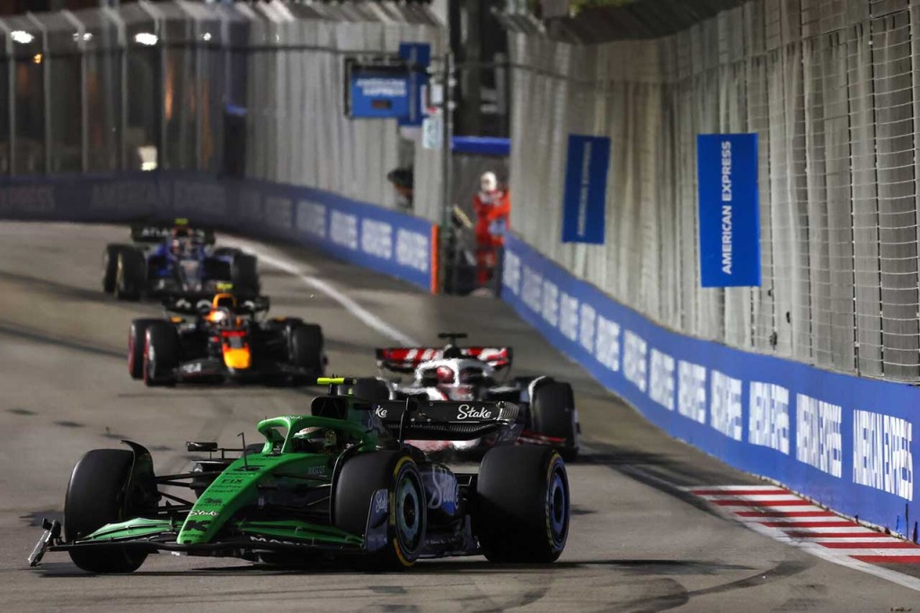 2025年F1第18戦シンガポールGP フランコ・コラピント(アルピーヌ)の後ろを走るニコ・ヒュルケンベルグ(キック・ザウバー)がターン7でスピン