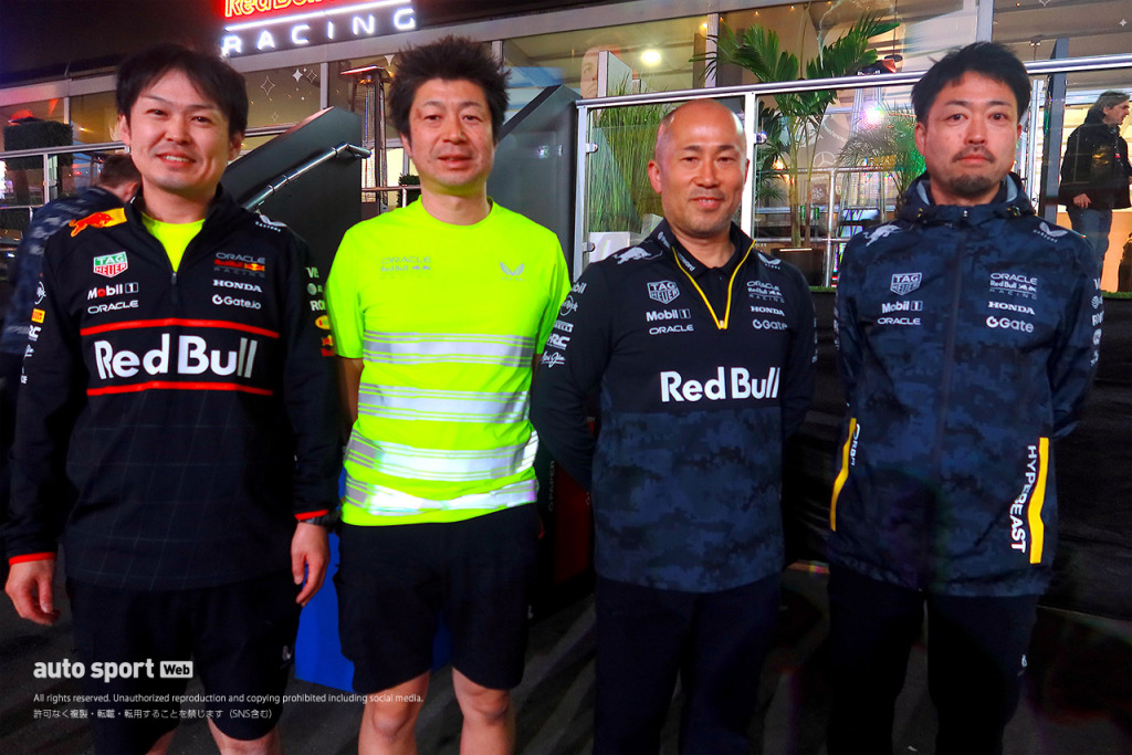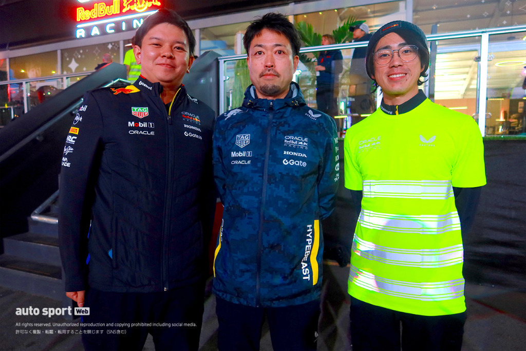2025年F1第22戦ラスベガスGP レッドブルと150戦目を戦ったHRCのスタッフ(エンジニア)たち。左から細田大雅(フェルスタッペン車/PUシステムエンジニア)、折原伸太郎ゼネラルマネージャー、久保哲宏(角田車/PUシステムエンジニア)