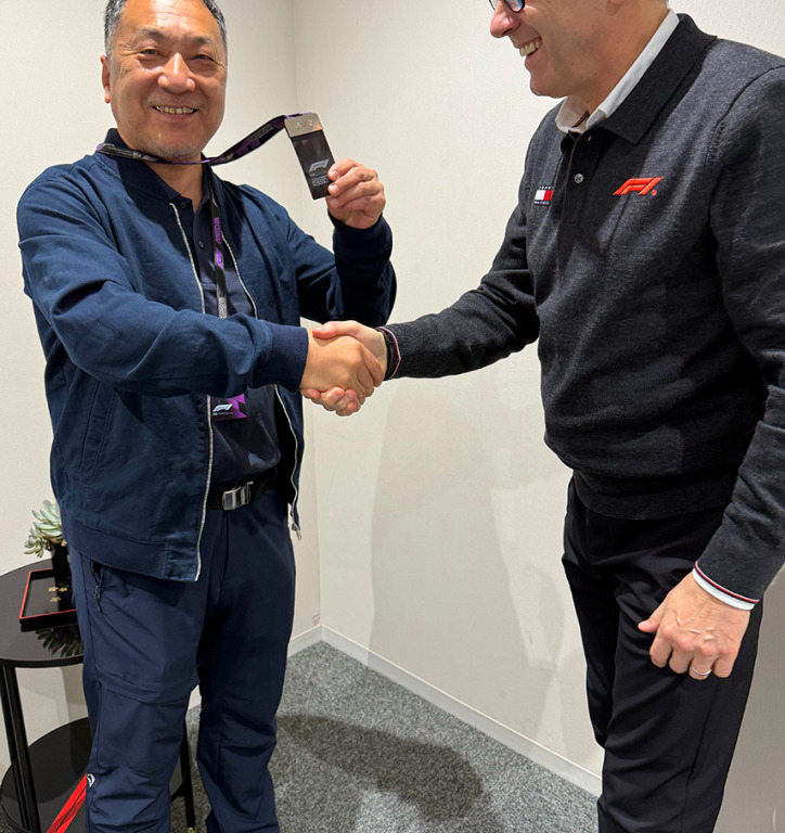 F1ジャーナリスト尾張正博氏に500戦記念パスが贈られる。ドメニカリCEO自ら祝福