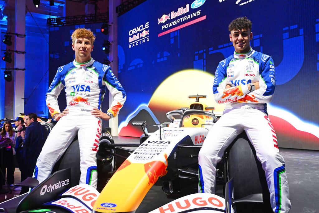 レッドブル&レーシングブルズの2026年カラーリング発表会に出席したリアム・ローソンとアービッド・リンドブラッド(レーシングブルズ)