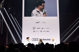 ドイツ・ベルリン市内で行われた盛大な発表会で登壇するビノット