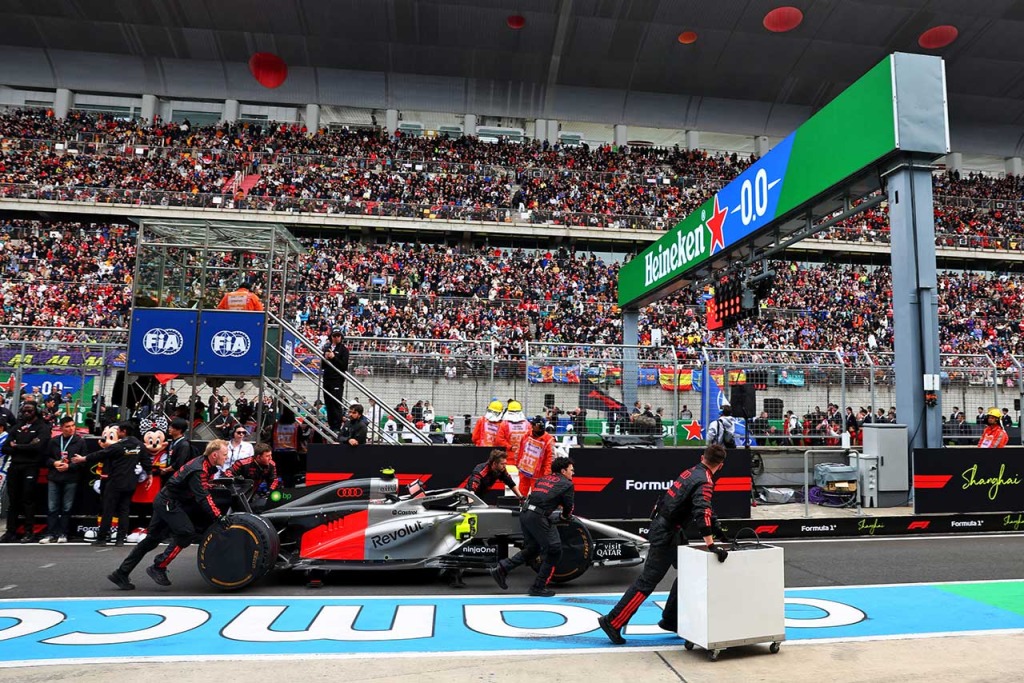 2026年F1第2戦中国GP決勝 スタート前にトラブルが発生し、グリッドからピットレーンに運ばれたガブリエル・ボルトレート(アウディ)