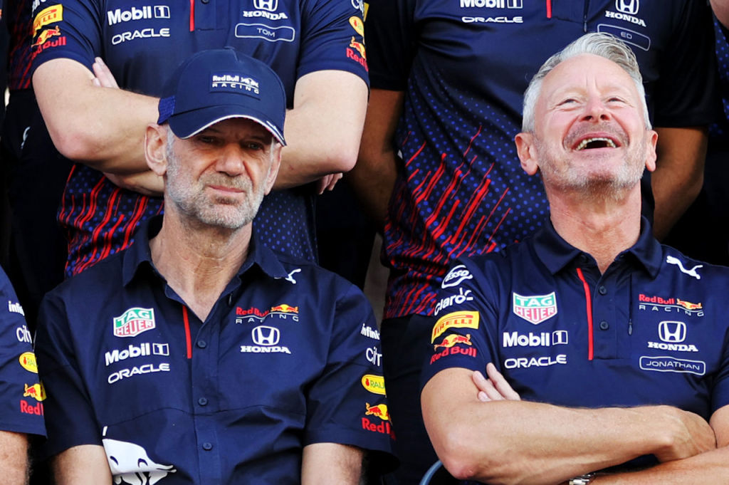 2021年F1アブダビGP レッドブルの記念撮影でのエイドリアン・ニューウェイ(当時チーフテクニカルオフィサー)とジョナサン・ウィートリー(当時チームマネージャー)