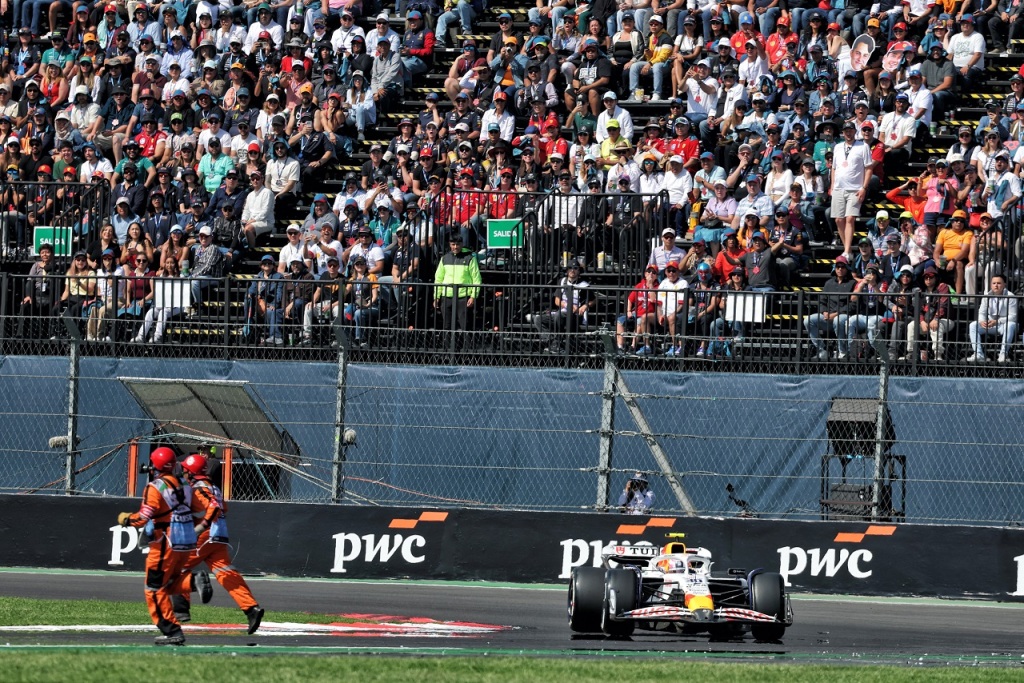 2025年F1第20戦メキシコシティGP決勝 リアム・ローソン(レーシングブルズ)の前でコースを横切るマーシャルたち