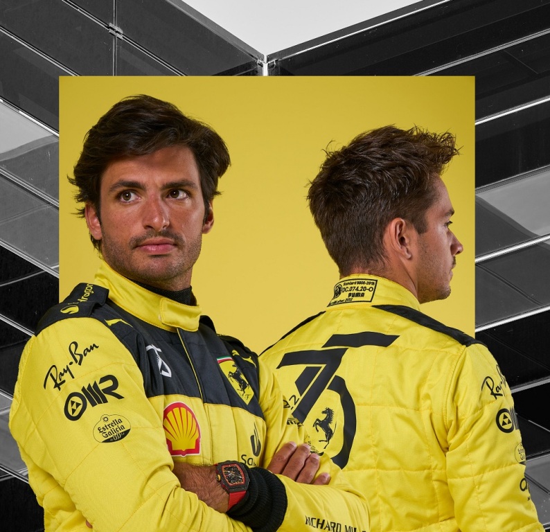 2022年F1第16戦イタリアGP スペシャルカラーのレーシングスーツを身に着けたカルロス・サインツとシャルル・ルクレール(フェラーリ)