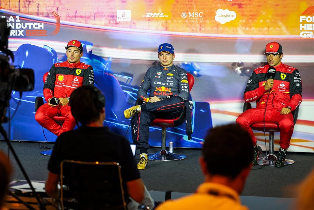 2022年F1第15戦オランダGP予選後会見 PPマックス・フェルスタッペン(レッドブル)、2番手シャルル・ルクレール(フェラーリ)、3番手カルロス・サインツ(フェラーリ)