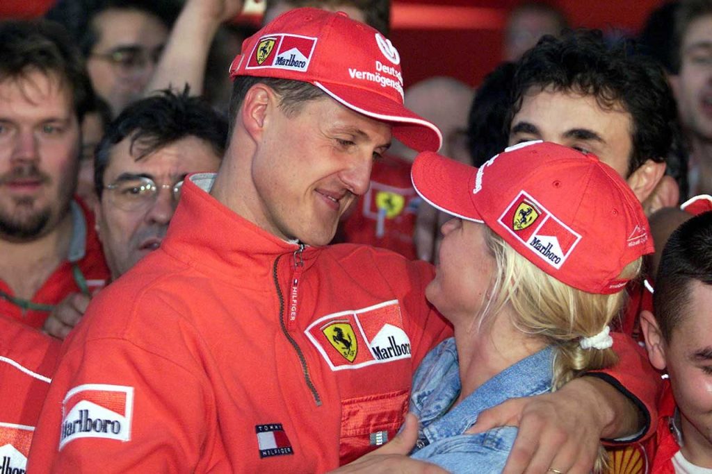 2000年F1第16戦日本GP 妻コリーナとタイトル獲得を喜ぶミハエル・シューマッハー(フェラーリ)