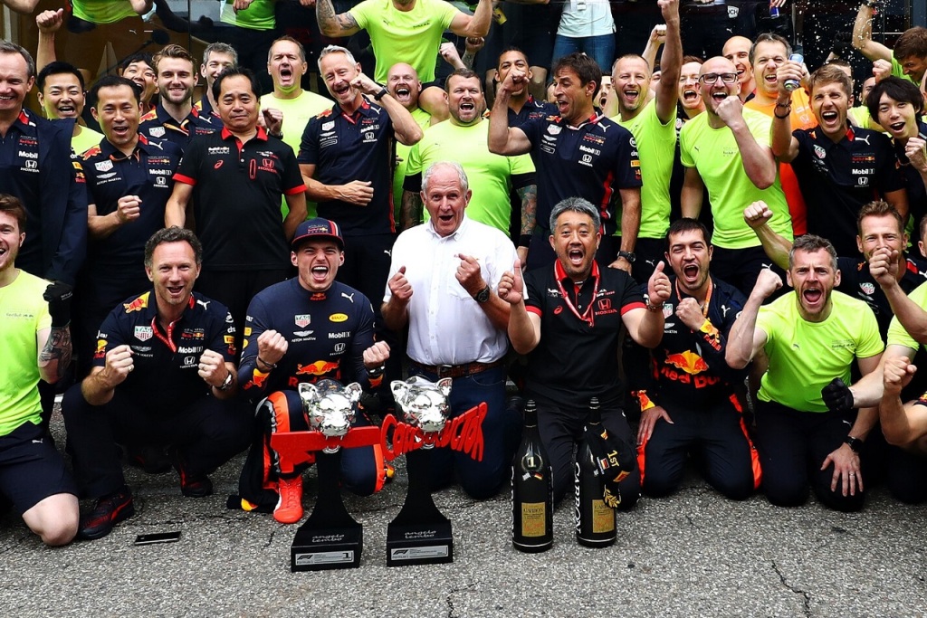 2019年F1第11戦ドイツGP日曜 マックス・フェルスタッペン(レッドブル・ホンダ)の優勝を祝うチーム