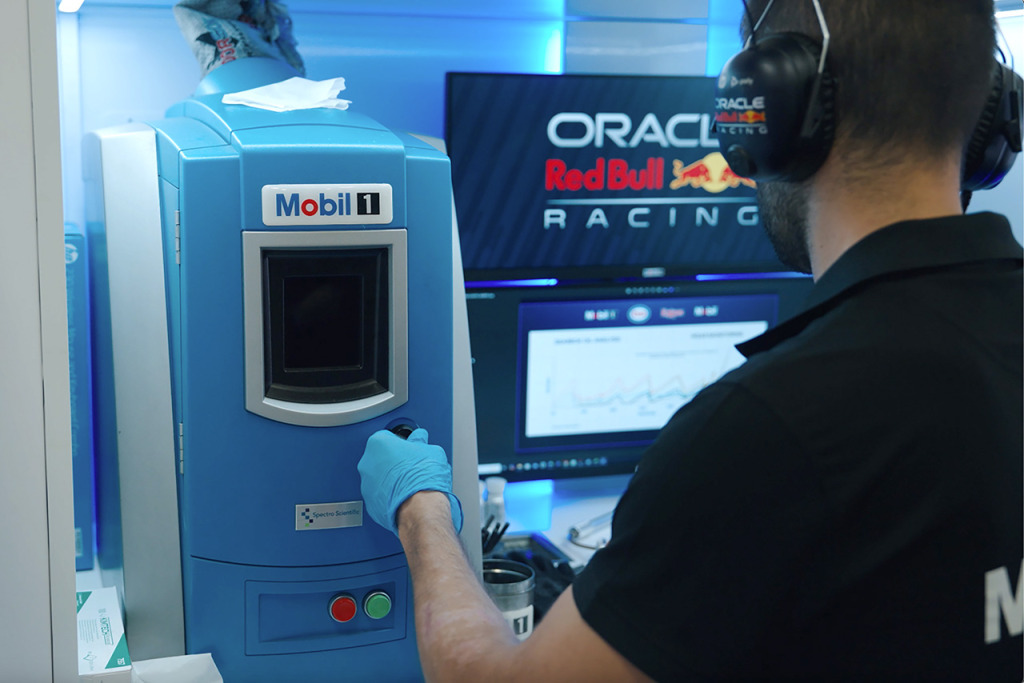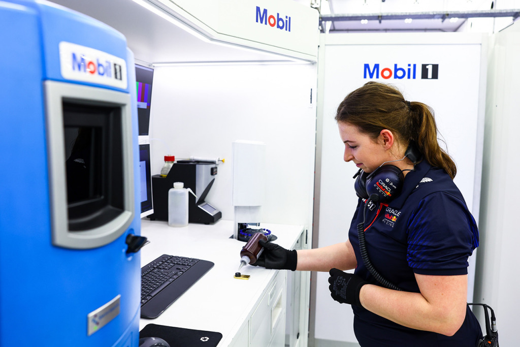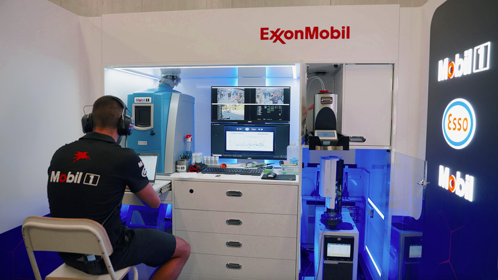 ガレージ内に設置されたエクソン・モービルのラボにて、オイルの分子チェックが行われる