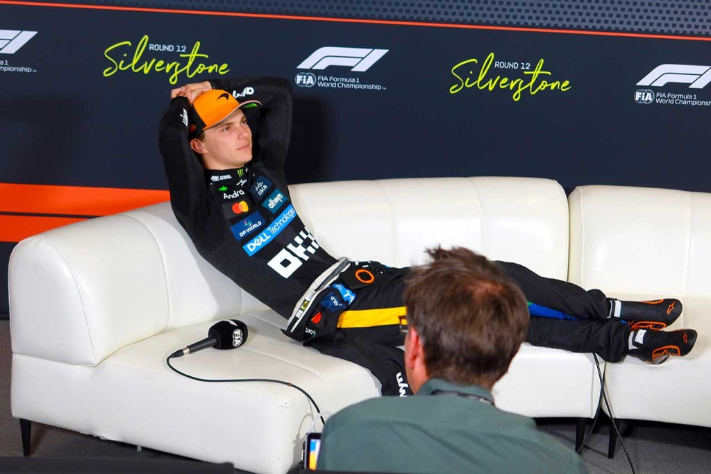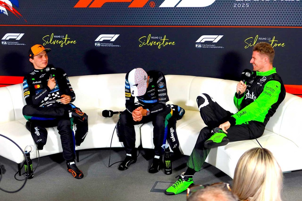 2025年F1第12戦イギリスGPレース後会見 オスカー・ピアストリ(マクラーレン)からニコ・ヒュルケンベルグ(キック・ザウバー)に、「レゴ製トロフィーはどう?」と質問