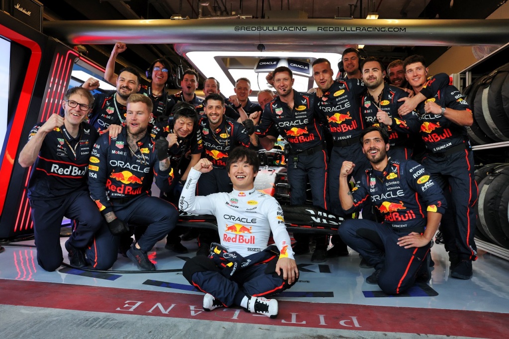 角田裕毅(レッドブル)と担当チームメンバーが記念撮影