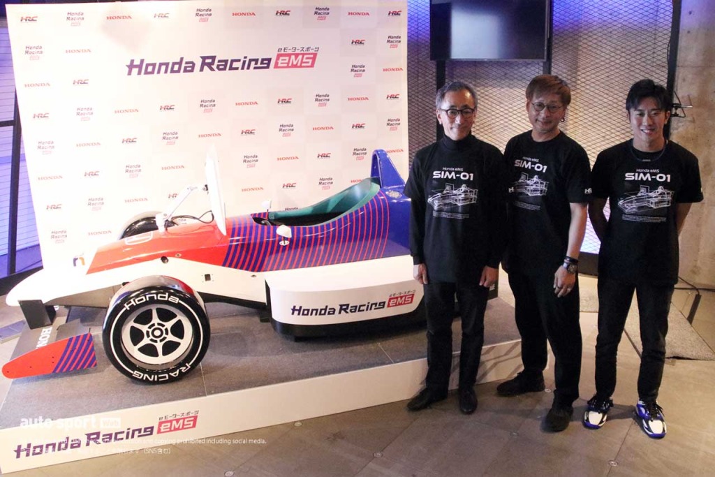 11月11日に都内で発表されたHonda eMS SIM-01。ドライバーの小出峻、開発責任者である岡義友氏らが登壇