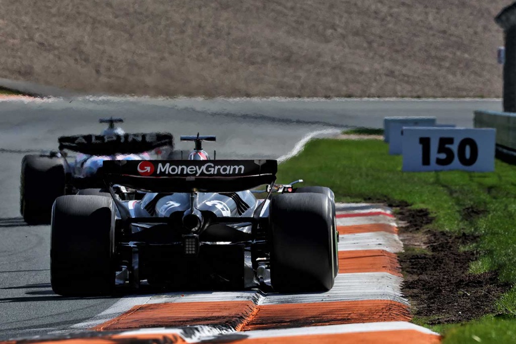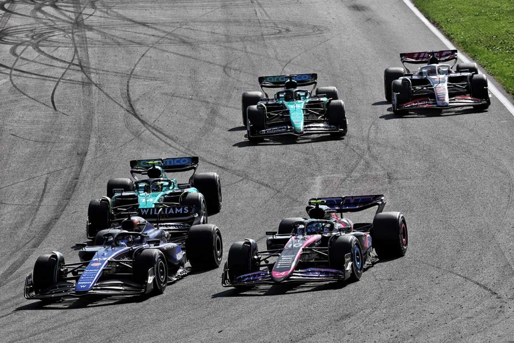 2024年F1第15戦オランダGP アレクサンダー・アルボン(ウイリアムズ)、ピエール・ガスリー(アルピーヌ)、フェルナンド・アロンソ(アストンマーティン)、ランス・ストロール(アストンマーティン)、ケビン・マグヌッセン(ハース)によるポジション争い