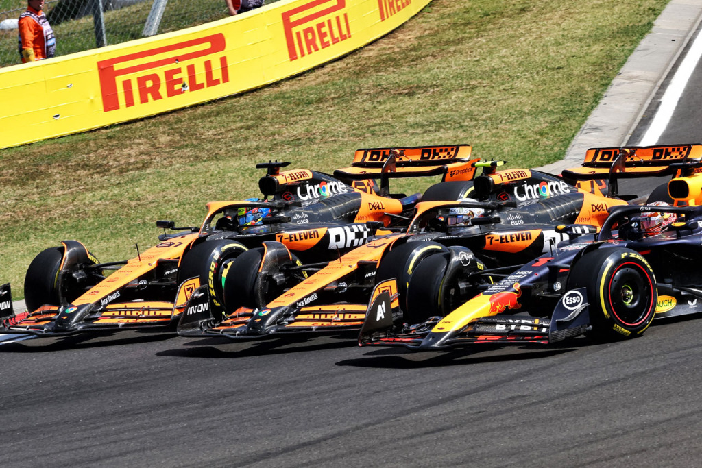 2024年F1第13戦ハンガリーGP 1周目ターン1でのオスカー・ピアストリ(マクラーレン)、ランド・ノリス(マクラーレン)、マックス・フェルスタッペン(レッドブル)の3ワイドバトル