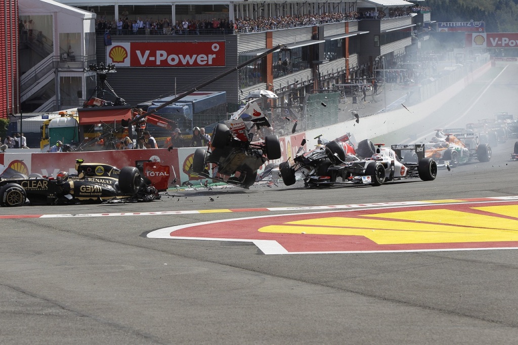 2012年F1ベルギーGP スタート直後、ロマン・グロージャン(ロータス)が引き起こした多重クラッシュ
