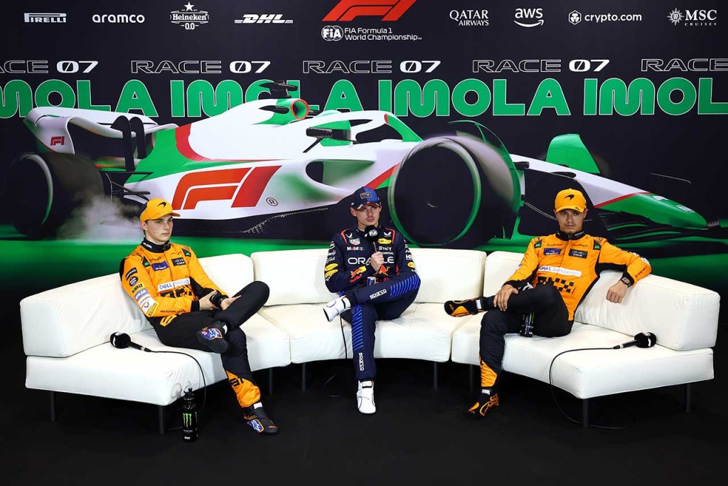 2024年F1第7戦エミリア・ロマーニャGP予選後会見 左から2番手オスカー・ピアストリ(マクラーレン)、PPマックス・フェルスタッペン(レッドブル)、3番手ランド・ノリス(マクラーレン)
