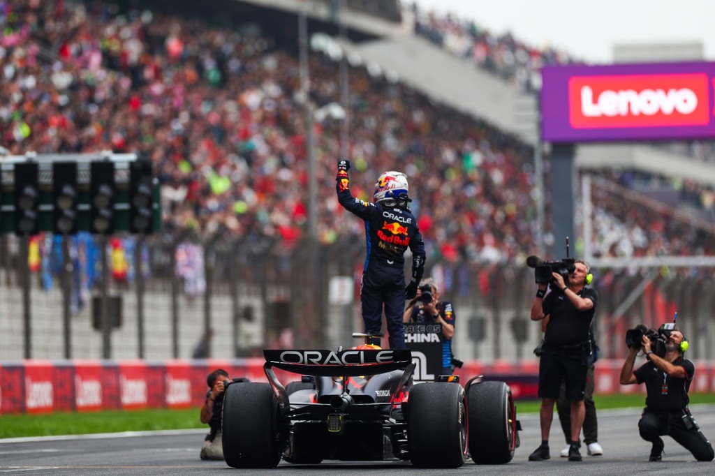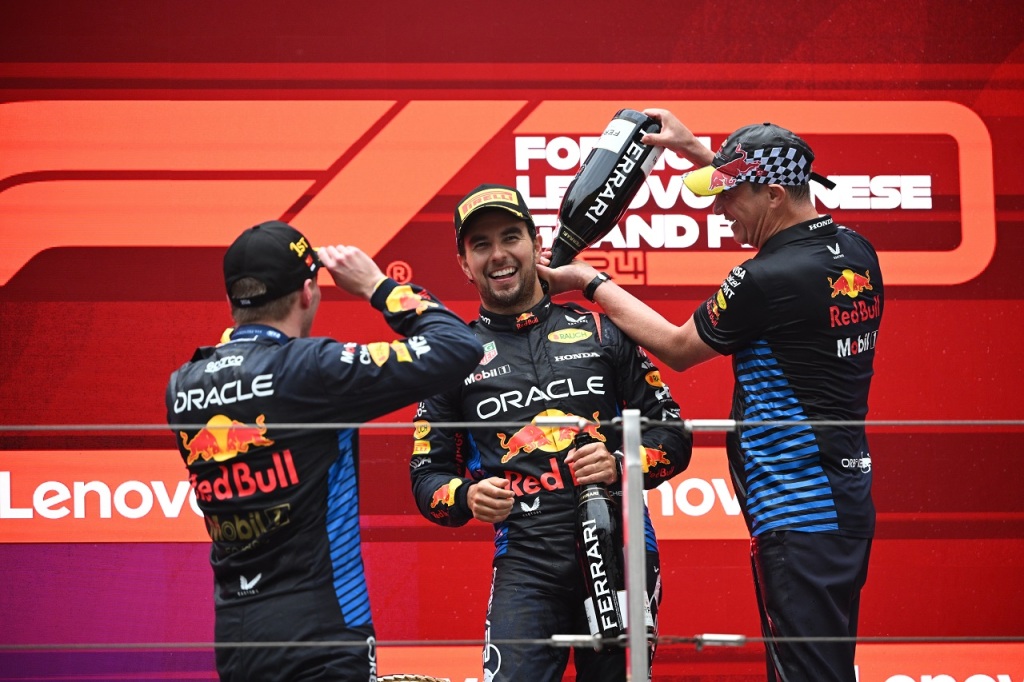 2024年F1第5戦中国GP表彰式 優勝マックス・フェルスタッペン(レッドブル)、2位ランド・ノリス(マクラーレン)、3位セルジオ・ペレス(レッドブル)