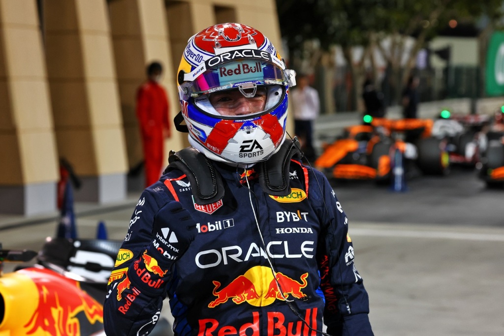 2024年F1第1戦バーレーンGP予選後会見 左から2番手シャルル・ルクレール(フェラーリ)、PPマックス・フェルスタッペン(レッドブル)、3番手ジョージ・ラッセル(メルセデス)