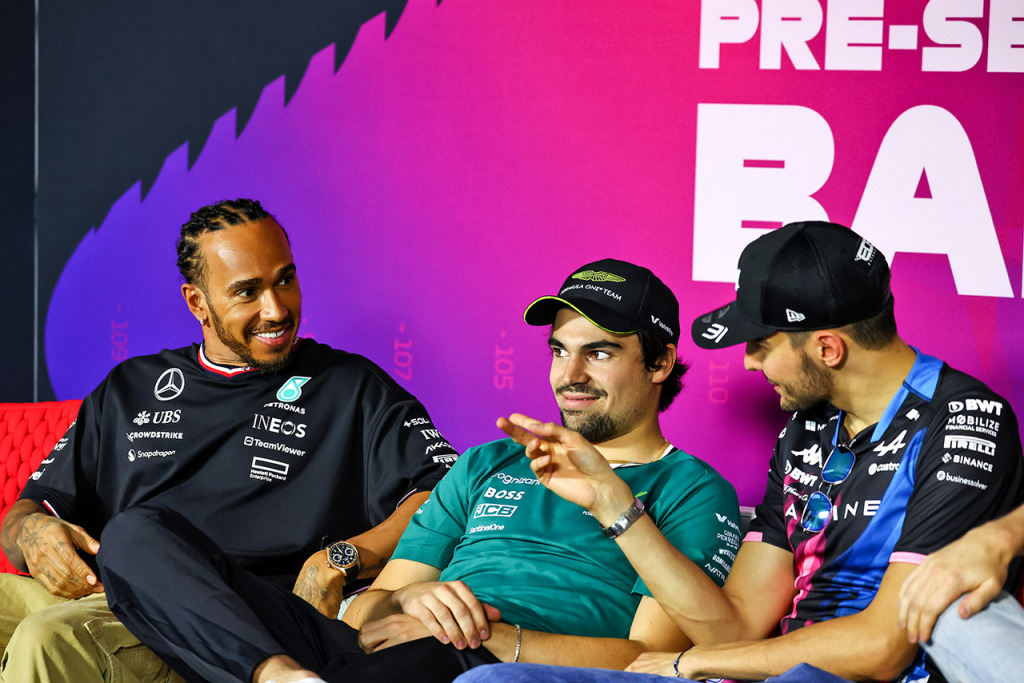 2024年F1バーレーンテスト プレスカンファレンスに出席したルイス・ハミルトン(メルセデス)(左)