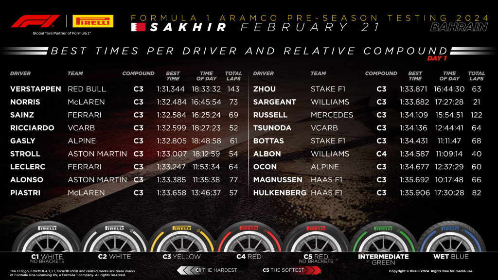 【タイム結果】2024年F1プレシーズンテスト1日目総合