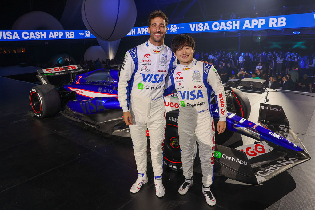 レーシング・ブルズのローレン・メキース代表、角田裕毅、ダニエル・リカルド、ピーター・バイエルCEO