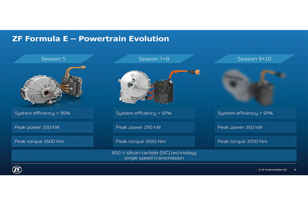 ZFの手がけてきたFEのパワートレーンの技術的変遷。出力/トルクはレギュレーションで決まっていることから上限値を当然発揮、注目すべきはシステム効率。いわゆる電費に効いてくる数値であり、ここをいかに高めるかが求められる。