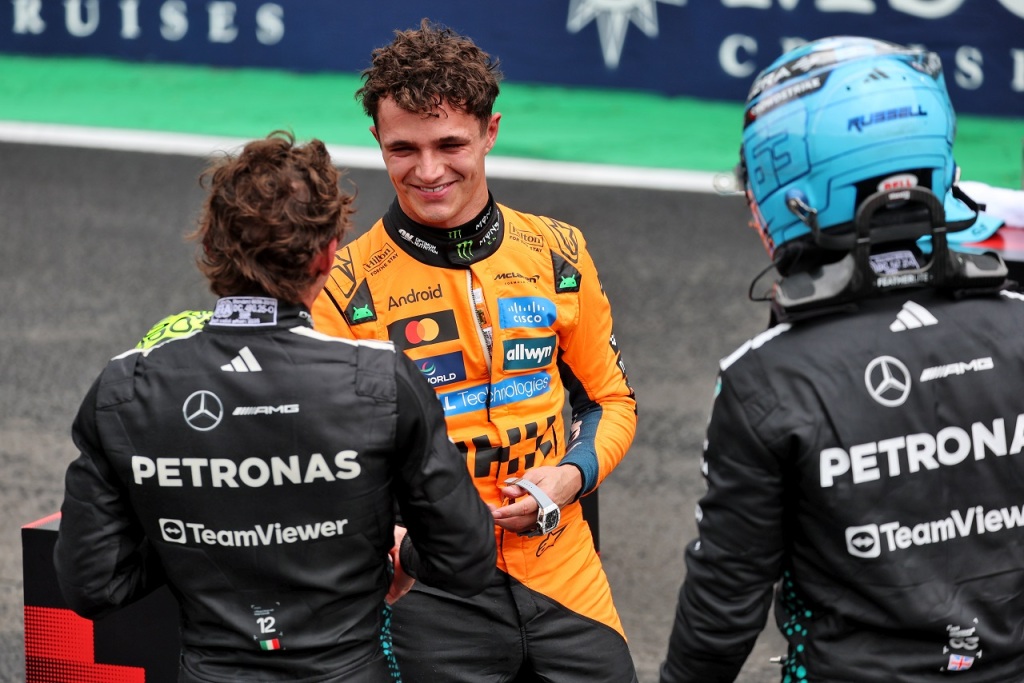 2025年F1第21戦サンパウロGP予選 左からPPランド・ノリス(マクラーレン)、2番手アンドレア・キミ・アントネッリ(メルセデス)、3番手シャルル・ルクレール(フェラーリ)