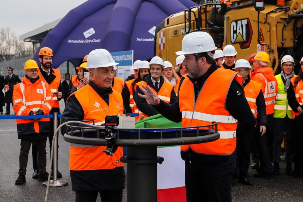 起工式に出席したマッテオ・サルビーニ副首相(左)とイタリア自動車クラブのアンジェロ・スティッキ・ダミアーニ会長(右)