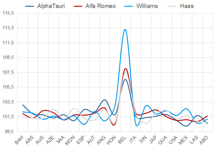 2023年F1 アルファタウリ、アルファロメオ、ウイリアムズ、ハースのPPとのタイム差