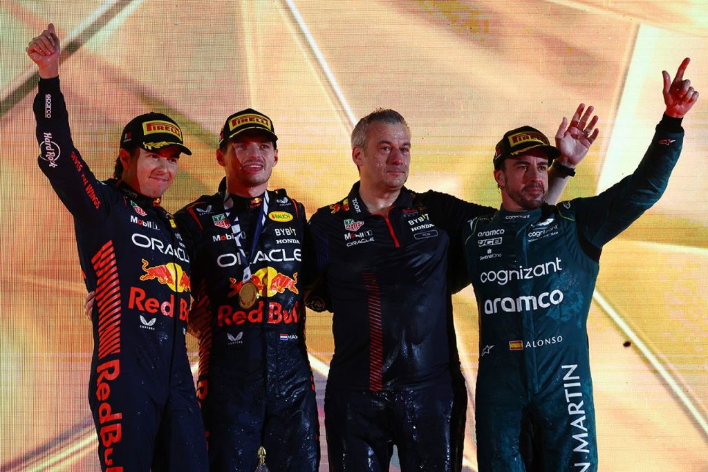 2022年F1第1戦バーレーンGP表彰式 左からセルジオ・ペレス(レッドブル)、マックス・フェルスタッペン(レッドブル)、フェルナンド・アロンソ(アストンマーティン)