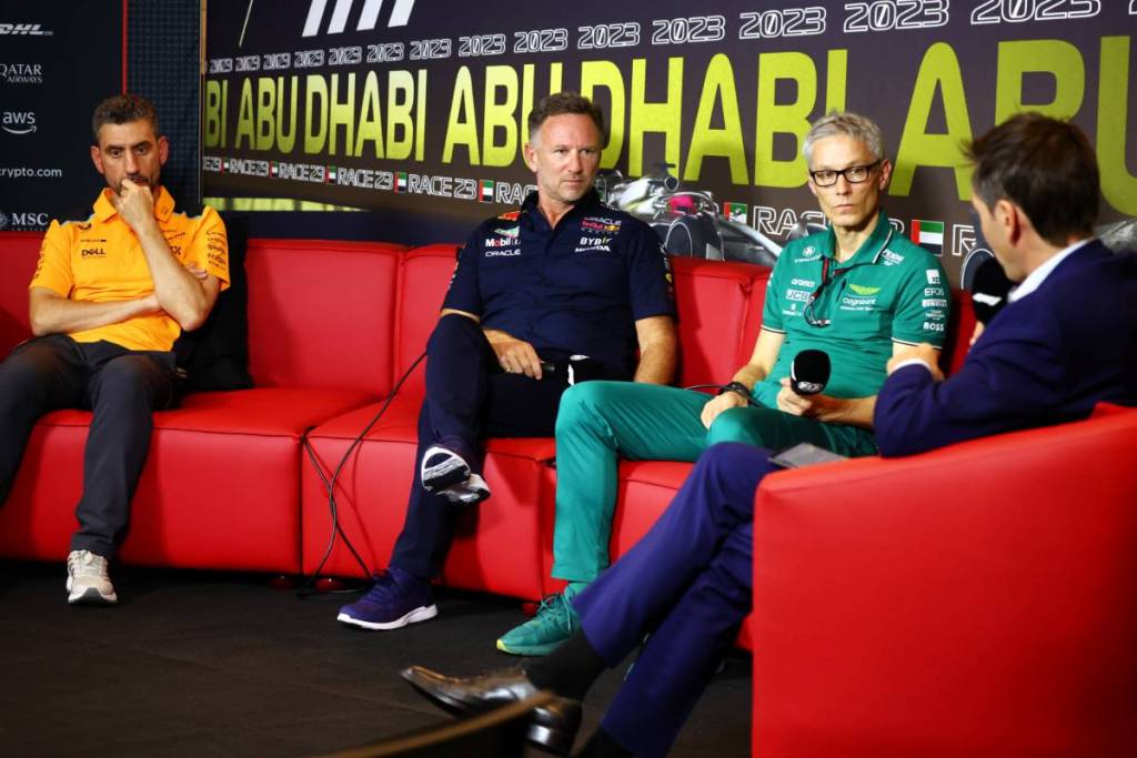 2023年F1第23戦アブダビGP金曜日 FIA会見 左からアンドレア・ステラ代表(マクラーレン)、クリスチャン・ホーナー代表(レッドブル)、マイク・クラック代表(アストンマーティン)