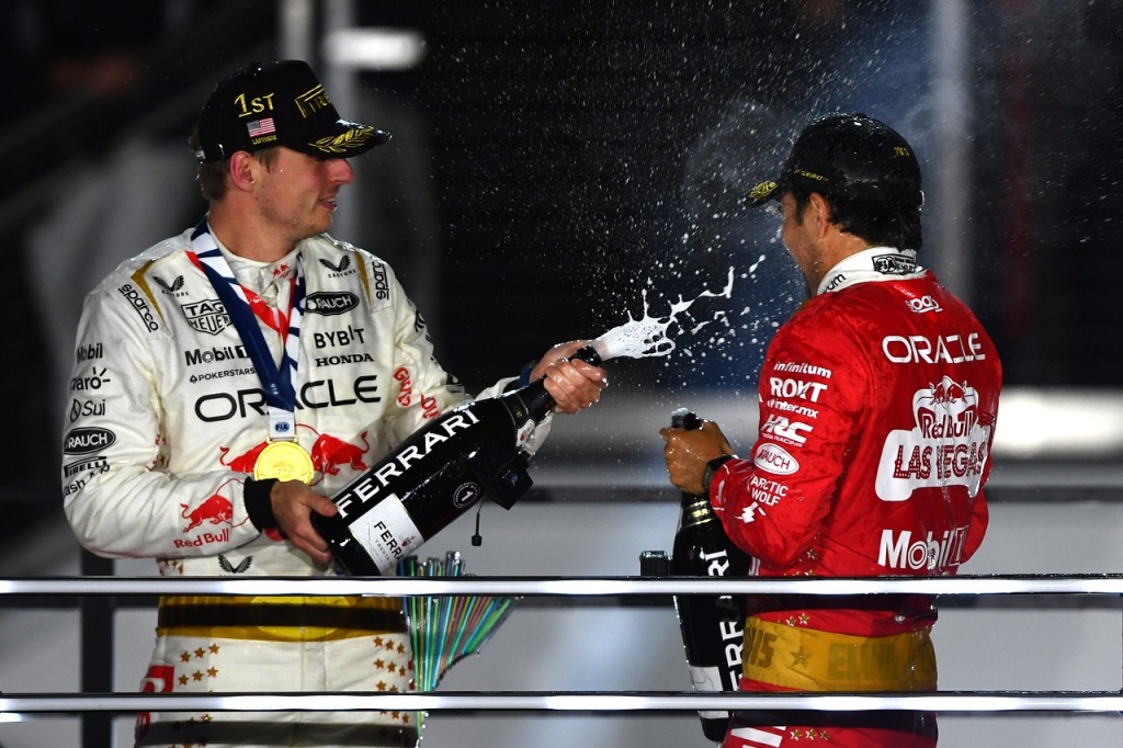 • 2023年F1第22戦ラスベガスGP 優勝したマックス・フェルスタッペンと3位セルジオ・ペレス(レッドブル)