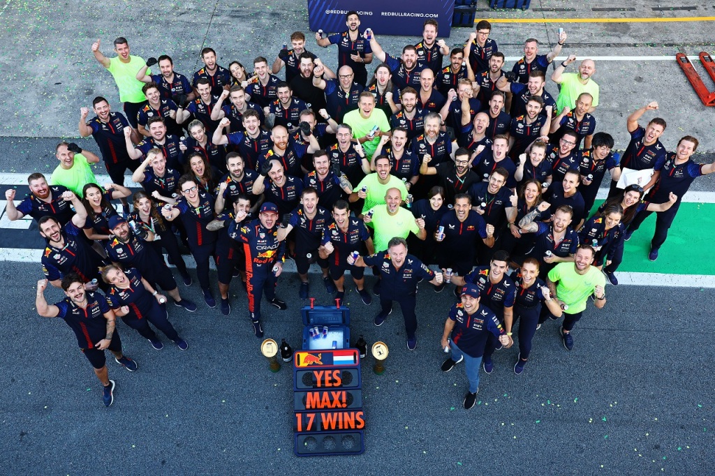 2023年F1第21戦サンパウロGP マックス・フェルスタッペン(レッドブル)のシーズン17勝目を祝うチーム