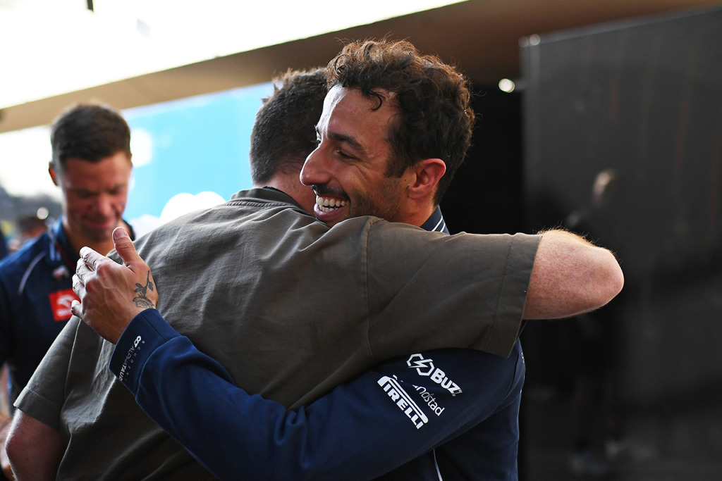 2023年F1第20戦メキシコシティGP 予選終了直後、チームと予選4番手を喜ぶダニエル・リカルド(アルファタウリ)