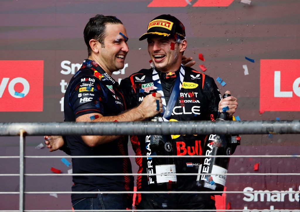 2023年F1第19戦アメリカGP表彰式 ジョン・ハモンド(フィジオセラピスト)&通算50勝目を挙げたマックス・フェルスタッペン(レッドブル)