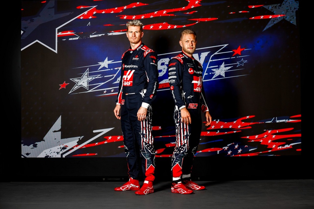 2023年F1第19戦アメリカGP 特別カラーリングのレーシングスーツを身に着けたニコ・ヒュルケンベルグとケビン・マグヌッセン(ハース)