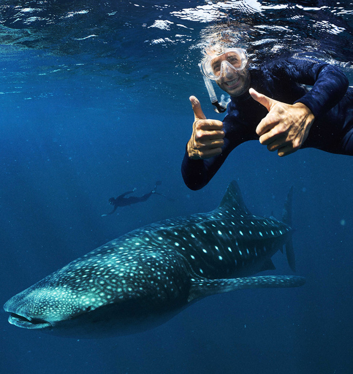 ニンガルーリーフでジンベイザメと一緒に泳ぐダニエル・リカルド