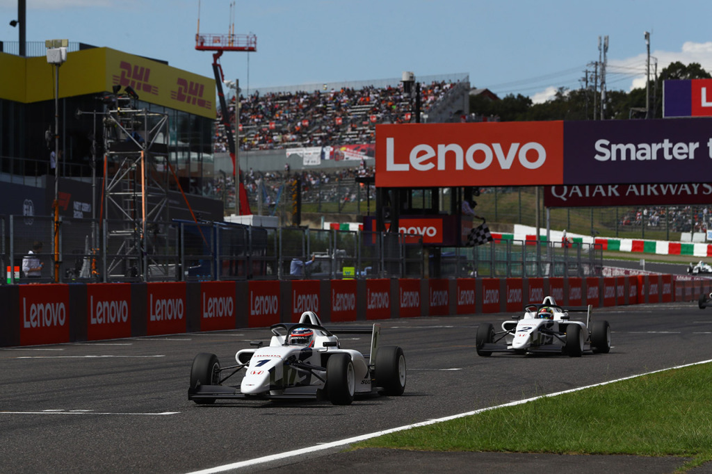 HRS鈴鹿に導入される新型車のデモランを行った佐藤琢磨と岩佐歩夢