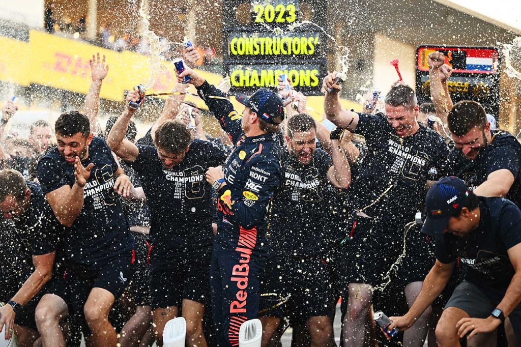 2023年F1第17戦日本GP コンストラクターズタイトル決定の記念撮影でレッドブルを掛け合うマックス・フェルスタッペン