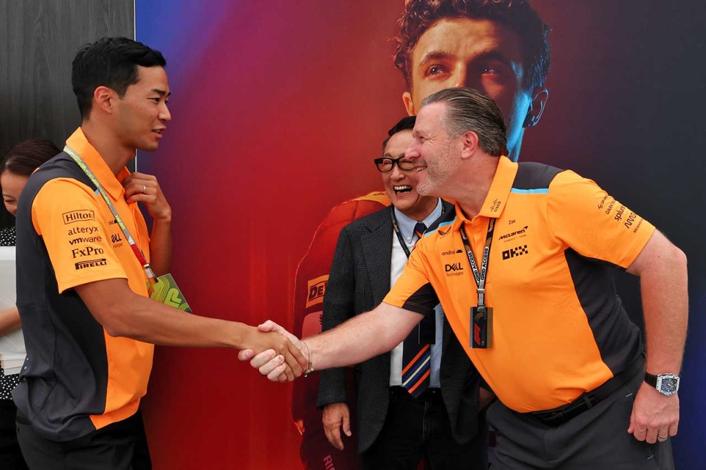 2023年F1第17戦日本GP マクラーレンのザック・ブラウンCEOと握手をする平川亮。笑顔のモリゾウ