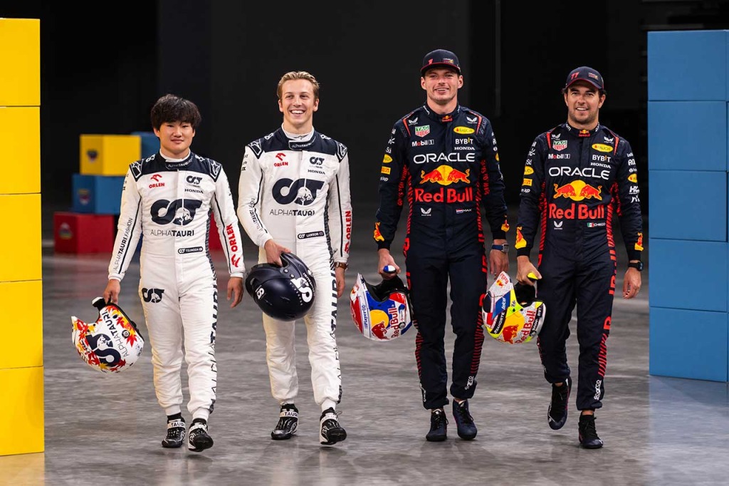 日本の軽トラで対決を行う『Unserious Race Series』エピソード3の収録に参加した角田裕毅、リアム・ローソン、マックス・フェルスタッペン、セルジオ・ペレス