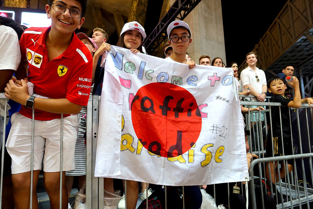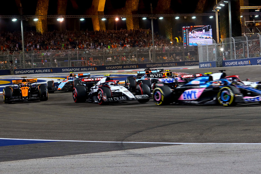2023年F1第16戦シンガポールGP スタート後、順位を争う角田裕毅(アルファタウリ)&セルジオ・ペレス(レッドブル
