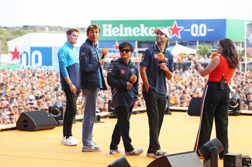 2023年F1第14戦オランダGP ファンイベントに登場した角田裕毅とダニエル・リカルド(アルファタウリ)、アレクサンダー・アルボンとローガン・サージェント(ウイリアムズ)