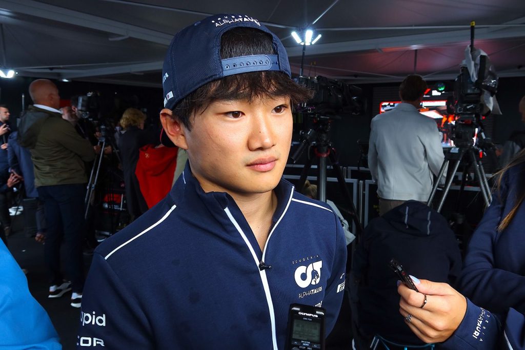 囲みインタビューを受ける角田裕毅(アルファタウリ)