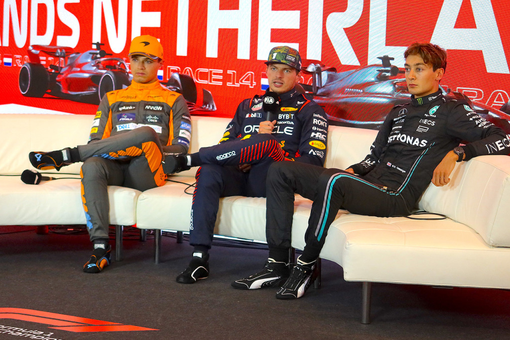 2023年F1第14戦オランダGP PPのマックス・フェルスタッペン(レッドブル)、2番手のランド・ノリス(マクラーレン)、3番手のジョージ・ラッセル(メルセデス)