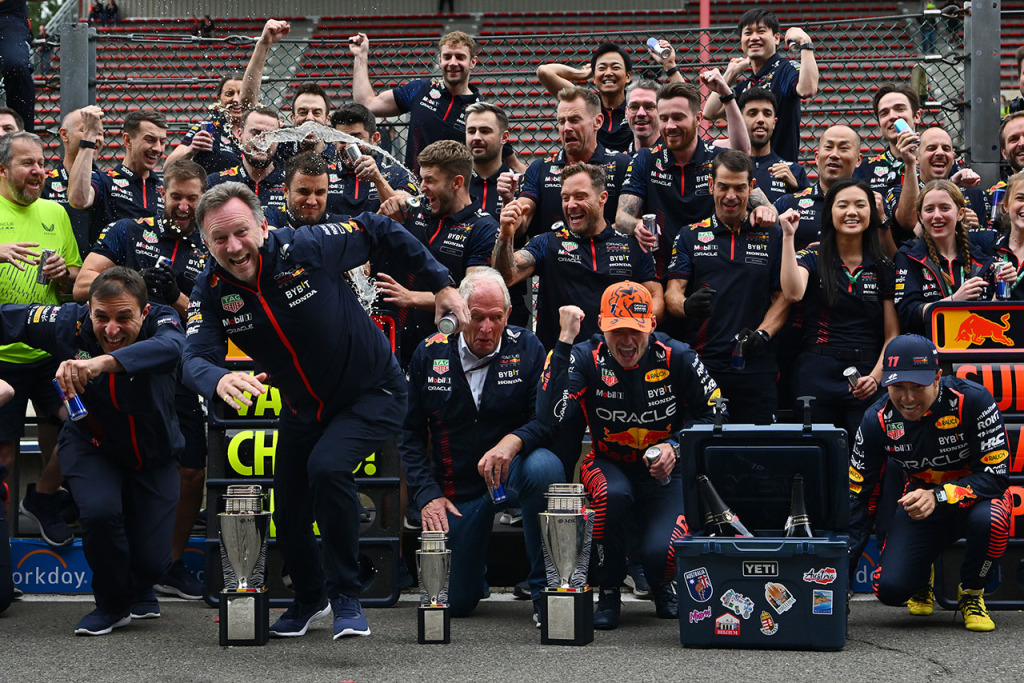 レッドブルF1、またもトロフィーが壊れる。記念撮影時にピットボードの下敷きに/F1第13戦