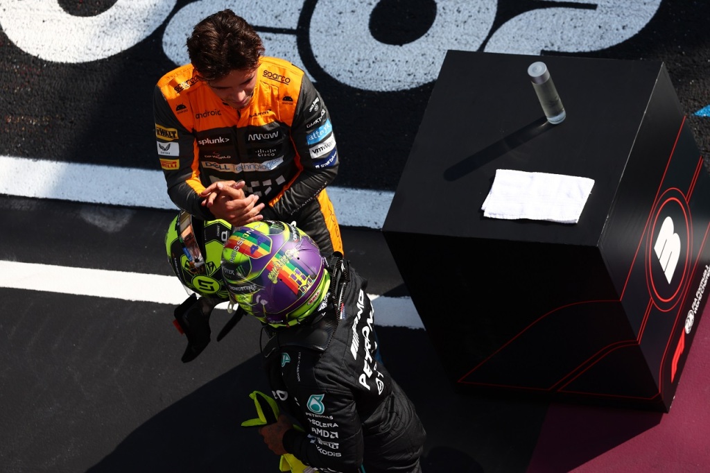 2023年F1第12戦ハンガリーGP 予選3番手のランド・ノリス(マクラーレン)とポールポジションのルイス・ハミルトン(メルセデス)
